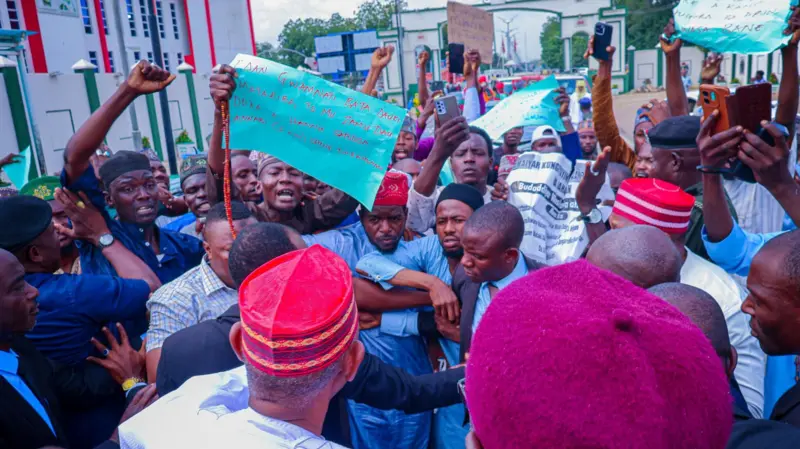 Masu zanga-zangar sun taru a kofar gidan gwamnati, inda Gwamna Abba Kabir Yusuf ya karɓe su tare da yin jawabi.
